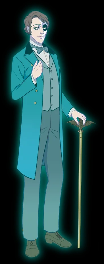 He is described as the most mysterious ghost in the Mansion, his name having been lost to time, with his page in the Ghost Registry consisting entirely of observations of his behavior by the staff or rumors spread around by the other ghosts in the Mansion. However, the Withering Man never says a word, only letting his gentlemanly actions speak for him and whenever the question is raised, he taps his cane twice and disappears from the room to dramatically avoid the subject. Z.J. believes him to be an Englishman from his cane and his strict adherence to tea time, which some ghosts have come to use as a clock. The Withering Man's page, along with his cane and a cup of tea, are found in the Conservatory, with the password protected portion of the website surmising that he stole his page to maintain the mystery surrounding himself.