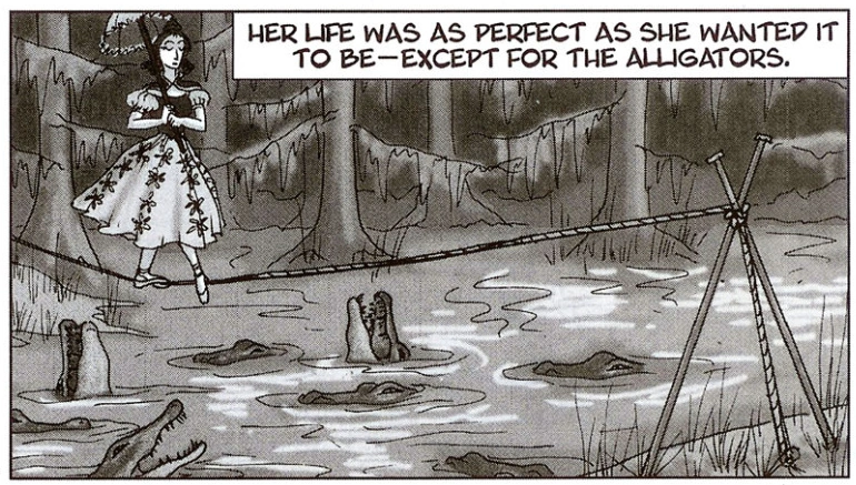 In the Stretching Room, the alligator appears in the portrait of the Tightrope Walker after the painting elongates itself. The alligator is shown in the painting to be eagerly awaiting the tightrope walker to fall into its jaws while her tightrope line is about to snap.