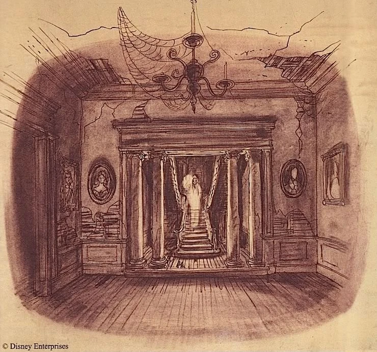 Ken Anderson made concept art of the Haunted Mansion featuring a ghost clearly modelled after the Brown Lady. It is known that Ken Anderson frequently attempted to integrate famous ghosts and villains from pop-culture but it is unknown if the Brown Lady was intended to be one of them or merely a source of inspiration for the mansion's original characters. Anderson's artwork would serve as one of the inspirations behind the bride of the Mansion's attic, namely in her Beating-Heart incarnation created by Marc Davis. The art might have also inspired the design of Little Leota seen in the exit crypt.[1]