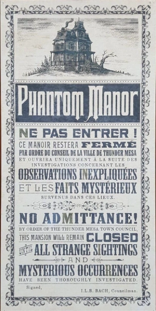 Over the decades following the fate of the Ravenswood family, Ravenswood Manor became unofficially known as "Phantom Manor" and became notorious as being a Haunted Mansion where supernatural occurrences would be seen and people would disappear. One notable disappearance was that of a criminal named Milo "One Eye" Jones who robbed the Big Thunder Mining Co. in 1882 and was suspected to have hid out in the abandoned manor only to never be seen again. Around the year 1884, admittance to the mansion was indefinitely cut off under the orders of Sheriff Will Ketchum and the Thunder Mesa Town Council in order to investigate a large number of mysterious disappearances of people who journeyed into Phantom Manor or merely the Boot Hill cemetery.