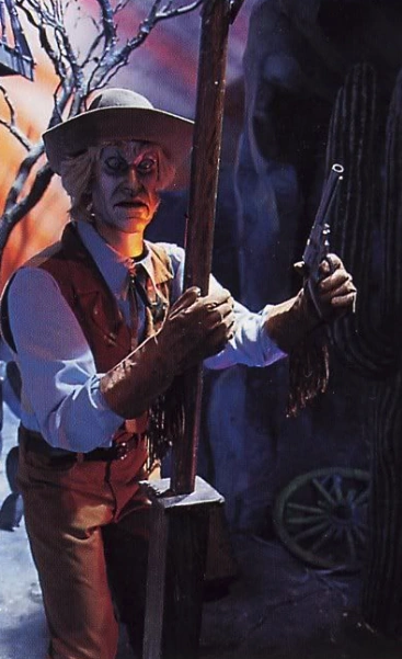 In the attraction the Sheriff appears in the Phantom Canyon sequence, taking cover in a shootout with an outlaw robbing a bank, with neither the sheriff nor the outlaw realizing that they cannot kill the other or be killed.
